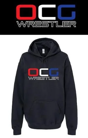 100% Heavy Cotton by Gildan Flourescent Vinyl Double-sided Says: OCG Wrestler on Front in Red, White & Blue (3-color flourescent) Says: The Lion Always Gets His Share (1-color white flourescent). Softstyle Hooded Sweatshirt.